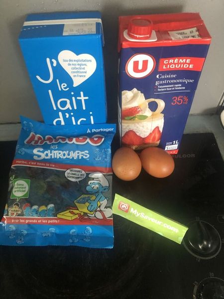 Je suis désolée mais alors je suis vraiment déçue de cette recette. Je l’ai faite avec mes enfants qui se faisaient une joie d’avoir de la glace aux stroumpfs. Sauf que la couleur n’y est pas, j’ai été obligée d’ajouter du colorant alimentaire bleu alors que j’avais respecté à la lettre la recette. Au niveau de la saveur, on reconnaît le goût des bonbons.