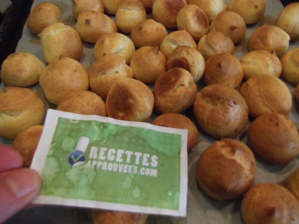 « Pendant la cuisson de la pâte, n'ouvrez surtout pas la porte du four, au risque de voir les choux s'écrouler. Vous pouvez aussi ajouter des petits dés de jambon, ou …. selon votre imagination, quelques petits dés de fromage et pas uniquement du râpé. Vous pouvez les congeler dans une boîte. Pour les consommer, laissez dégeler et mettre à four doux. »