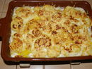 Mettre une couche de pommes de terre dans un moule à gratin, ajouter une couche de la crème au dessus, puis une couche de pommes de terre et finir avec une dernière couche de crème.