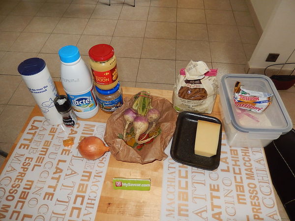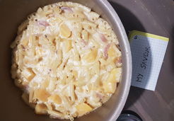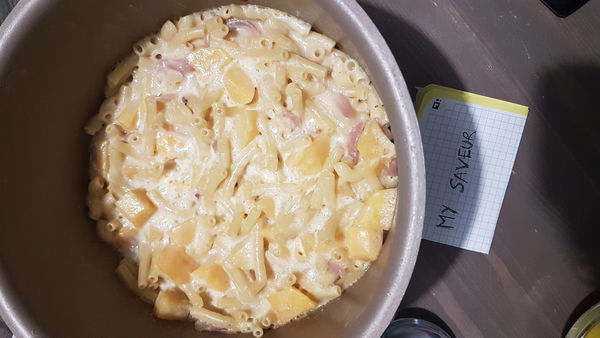 Dans un plat allant au four, mettre la béchamel, les pâtes et les légumes.