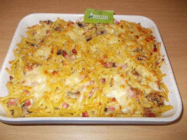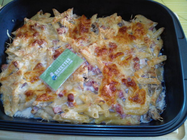 Nous avons apprécié ce gratin de pâte qui était bien crémeux, j'avais mis des dés de jambon. Recette très simple à faire et rapide. Nous l'avons accompagné de salade pour le repas du midi car le soir je préfère manger plus light.