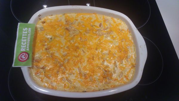 Verser le mélange de pâtes aux légumes dans un moule à gratin puis couvrir le tout de sauce au fromage, parsemer de fromage râpé et de pignons de pin torréfiés. Enfourner à 190°C pendant 10 à 15 min.