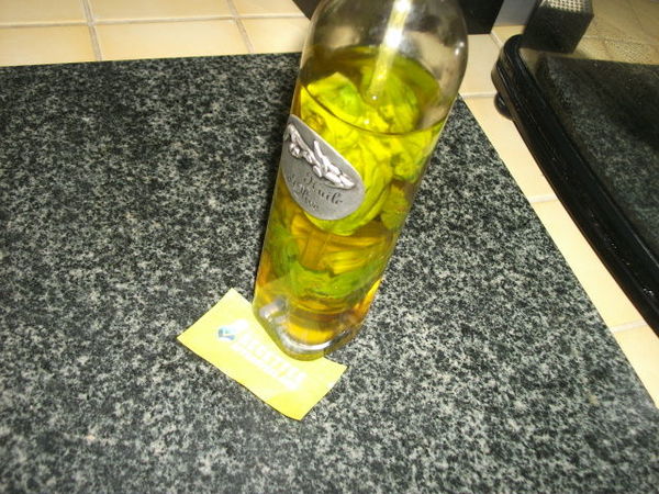 Au basilic : 5 branches de basilic frais et un litre d’huile d’olive ( plats de poissonx, plats de pâtes ou salade de tomates )