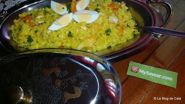 Faire fondre le beurre dans une grande sauteuse, ajouter l'oignon émincé finement avec le curcuma puis le riz cuit. Faire revenir en remuant constamment. (Ajouter un peu de bouillon de volaille si votre riz cuit 1 jour avant a trop séché au réfrigérateur.)