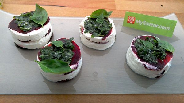 Alternez une couche de chèvre avec une couche de betterave. Terminez par la betterave.