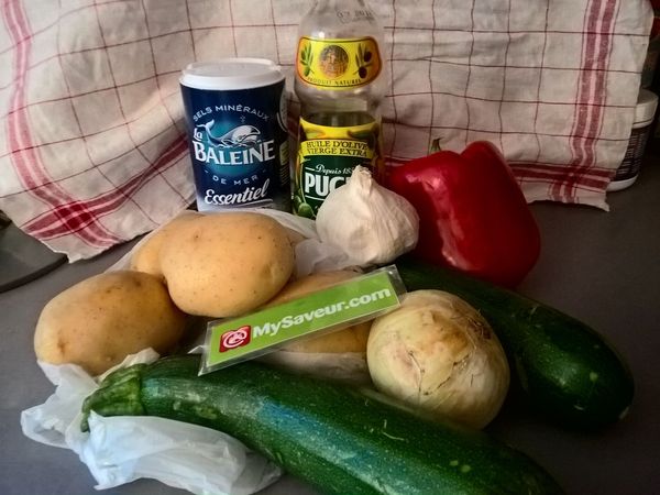 Mettre la courgette dans un plat allant au four. Couper les pommes de terre en petits cubes et les mélanger à la courgette. Saupoudrer de fromage râpé si vous le souhaitez.