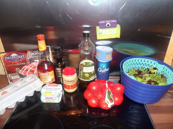 Une salade bien fraîche et très bonne. Ce fromage dans le jambon cru est une bonne idée et bien moins cher que le tout prêt en commerce ! Je prends l'idée !! La sauce est bonne, le mélange des vinaigres marche bien.