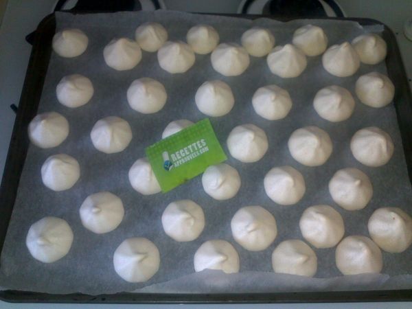Cuisson : tout de suite après (sinon elle va perdre l'air incorporé), sur une plaque recouverte de papier cuisson. Normalement, plus la temperature est basse mieux c'est (50°-60°C pendant 3-4 heures). Il ne faudrait pas dépasser 100°C ce qui fragilise la meringue mais bon, à 120°C ça marche aussi mais la meringue s'effrite plus facilement.?