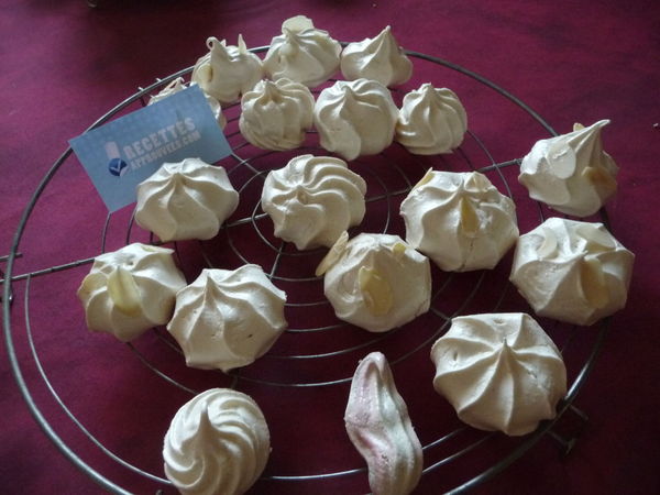 Très bonne recette qui s'adapte à n'importe quelle quantité de blancs, je la garde de côté. Mon four est un four au gaz sans thermostat, je l'ai mis au minimum mais c'est encore trop, il faudrait peut-être que je fasse de plus petites meringues. 18 heures après leur sortie du four, il ne reste rien.