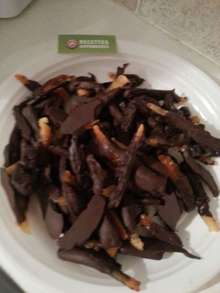 Il manque juste une petite indication sur le temps de trempage des écorces, sinon recette facile et qui rend bien, peut-être tempérer le chocolat . Voici les rescapés !