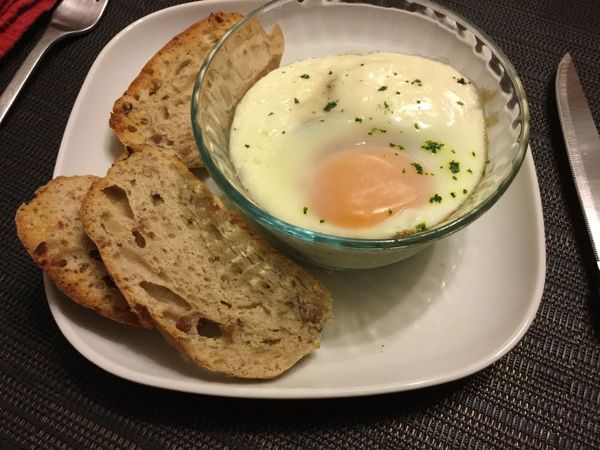 Un excellent œuf cocotte comme je les aime. La cuisson est parfaite, le goût des champignons avec l'œuf juste cuit, c'est un délice. J'aurais bien ajouté des oignons ou des échalotes tout de même. (J'ai juste oublié de mettre l'huile d'olive sur la photo)