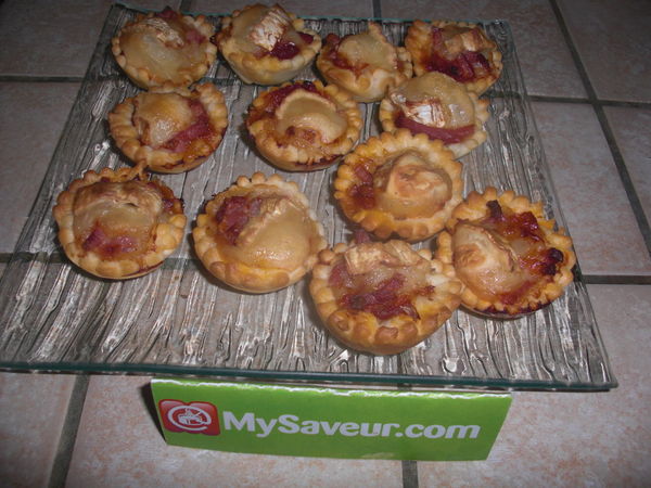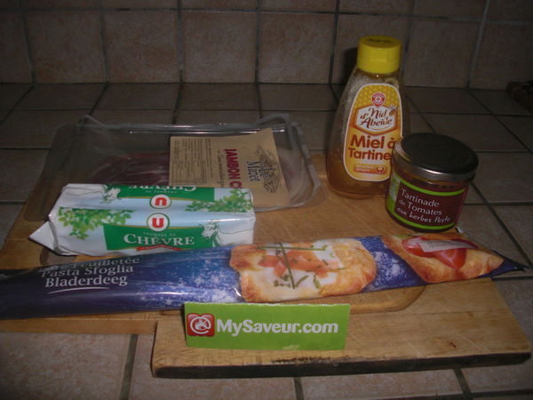Sur une plaque recouverte de papier de cuisson, déposer les pizzas. Les recouvrir de tartinade de tomates. Déposer des tranches de charcuterie. Verser un filet de miel et terminer par des tranche de bûche.