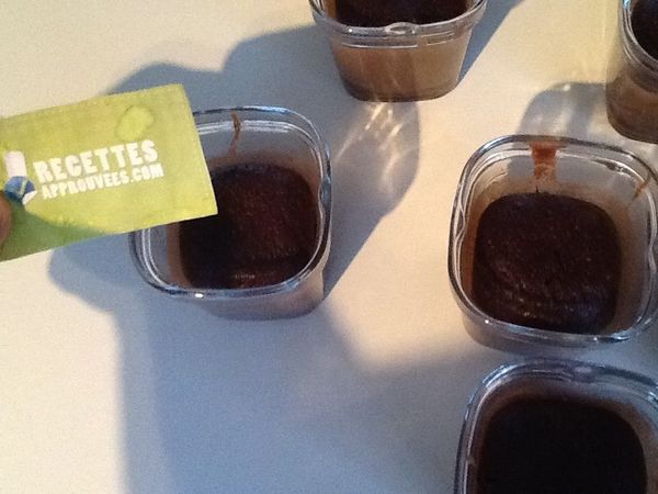 J'ai eu un peu peur quand j ai vu que la pâte était liquide mais au final, après cuisson des gâteaux moelleux, (ils portent bien leur nom) et bien chocolatés. Merci pour cette recette.