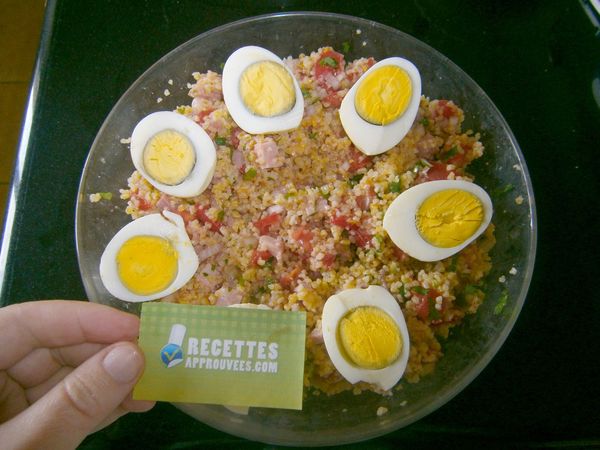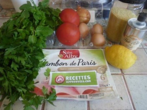 Un taboulé frais et agréable à manger, par contre, je reste vraiment perplexe sur l'ajout des œufs, je n'ai pas aimé car la texture est molle et ne se marie pas avec la graine. Mis à part cela, le jambon est une bonne idée, et l'ensemble a été bien apprécié.