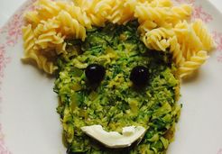 Ajouter les pâtes en guise de cheveux et faire une bouche avec 1/2 tranche de fromage de chèvre. Faire des yeux et servir (j'ai utilisé des olives pour faire les yeux).