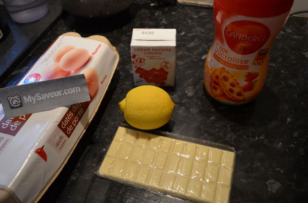 Mélanger le jus de citron et le chocolat blanc légèrement refroidi jusqu'à obtenir une texture lisse. Mélanger avec la préparation des jaunes et du sucre.