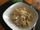 Une recette rapide à réaliser, nous avons apprécié, ça nous a fait penser aux spaghettis carbo revisitées. Pour plus de pep's, la prochaine fois j'ajouterai une marmite de bouillon ou une cuillère à café de veau dans la crème.
