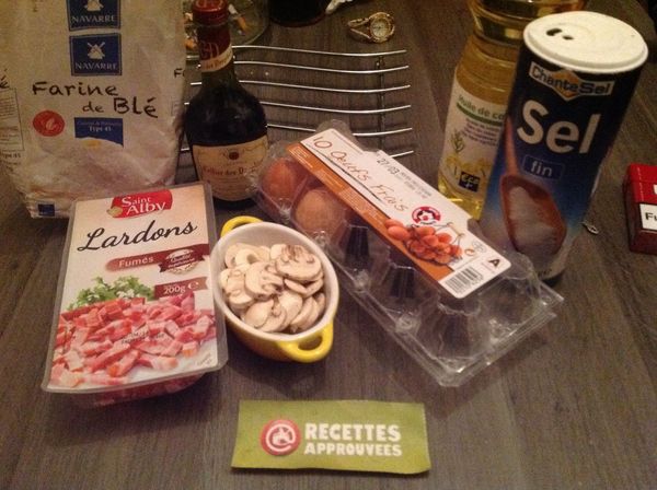 Dans un faitout, faire revenir les champignons avec un filet d'huile. Y ajouter les lardons, laisser cuire 5 min. Saupoudrer les lardons et champignons avec un peu de farine. Verser le vin rouge et l'eau. Laisser cuire à feu doux 15 min.