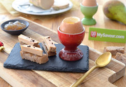 Servez les œufs avec les mouillettes, tartinées de chutney de poires et d'une tranche généreuse de foie gras.