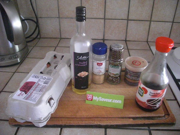 Comme j'étais toute seule je me suis permise de ne prendre que deux oeufs ! Le mélange 5 parfums et soja donne un bon goût à l'omelette, elle est parfaite pour un riz cantonais.