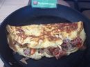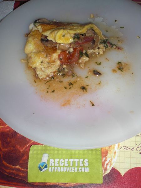 Bonne recette au niveau du goût, toutes les saveurs sont bien présentes. Résultat peu présentable néanmoins car la garniture était trop importante pour rabattre l'omelette sans la casser.