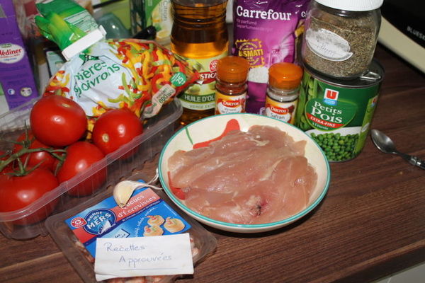 Mais il manque d'épices, d'autres choses... j'aurais bien ajouté des merguez, 1/2 à 1 chorizo, j'aurais bien mis 2 cuisses de poulet et 1 ou 2 blancs (au lieu de 500g de blanc de poulet) et pourquoi pas 100 gr de chair d'écrevisse des seiches. On peut ajouter des épices à paëlla si l'on en a chez soi. Par contre, beaucoup de petits pois (ça va j'aime ça) mais les enfants préfère sans. - 15/20