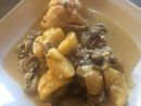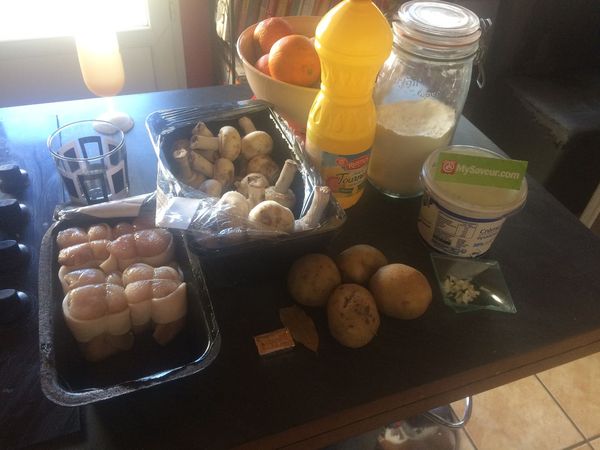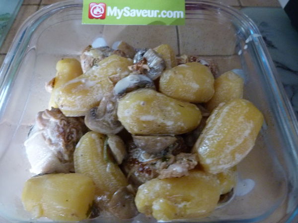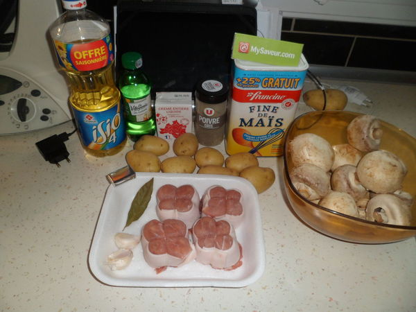 Oublie de l'huile sur la photo et je n'ai pas mis les champignons car allergie (j'ai donc mis des haricots en complément dans l'assiette ). La sauce est bien épaisse et effectivement il ne faut surtout pas saler en plus car ça l'était déjà beaucoup, les pommes de terre sont tendres, c'est un très bon plat, le vin blanc ne se sent pas, j'avais peur du contraire.