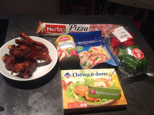 Dérouler la pâte à pizza sur la plaque et ajouter toute la boîte de sauce tomate pizzassimo. Bien la repartir partout, ajouter les poivrons, l'effiloché, la mozzarella râpée et les petit chèvres.