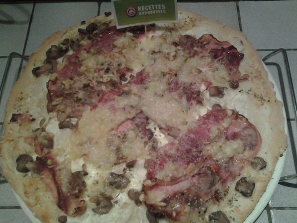 Pizza très rapide à préparer, ça change un peu de mettre de la crème à la place de la tomate, agréable au goût, nous l'avons dégusté avec une salade de tomate, bon repas du soir.