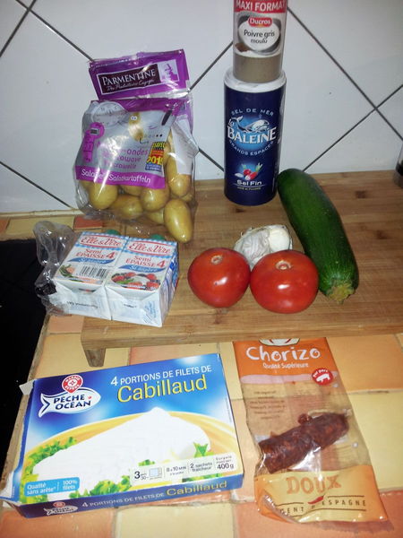 Ingrédients 250 g de pommes de terre Parmentine 1 courgette 1 tomate 2 filets de cabillaud 40 g de chorizo 12 cl de crème 1 gousse d'ail Sel Poivre Recette 1.