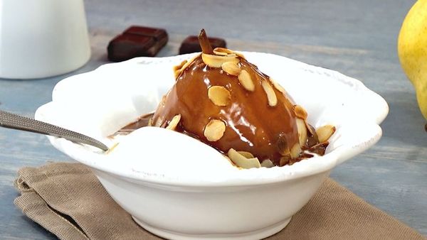 Dans des verrines, disposer un lit de crème au chocolat, les poires, la boule de glace et ajouter de nouveau un peu de crème au chocolat. Pour finir, ajouter les amandes effilées.