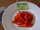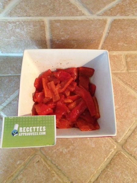 Les poivrons étaient bons mais un peu fades car j'ai l'habitude de les faire avec de l'huile d'olives parfumée au basilic. Je rajoute un peu de poivre.