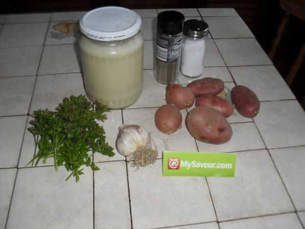 Éplucher et couper les pommes de terre en fines tranches. Émincer finement l'ail, hacher le persil.