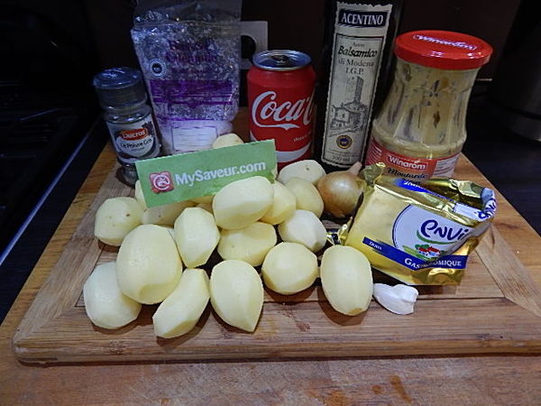 Grande surprise, nous nous attendions à manger des pommes de terre caramélisées et sucrées, mais pas du tout. Le goût est acidulé, je n'ai pas mis la moutarde. Dommage car elle doit donner la touche de piquant qui manque.