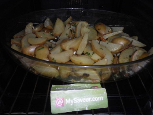 « Laisser cuire les pommes de terre jusqu’à la coloration que vous aimez. Chez nous on les fait très cuire car on aime qu’une croûte bien brune (voire un peu brûlée...) se forme au-dessus. Je fais aussi en sorte que certains côtés cuisent plus que d’autres pour avoir des parties très cuites et d’autres plus fondantes (c'est comme cela que faisait ma grand-mère).