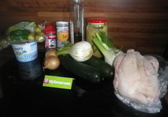 Tartiner le poulet de moutarde. Couper le fenouil en grosses lamelles, les courgettes en grosses rondelles et les oignons en lamelles.