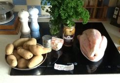 Mettre le poulet dans le plat et les pommes de terre autour.