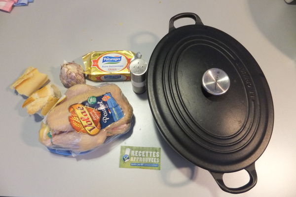 Ingrédients 1 beau poulet 1 tête d'ail (environ 12 gousses) 5 ou 6 tranches de pain rassi Beurre salé 1 cocotte en fonte ou une marmite Recette 1.