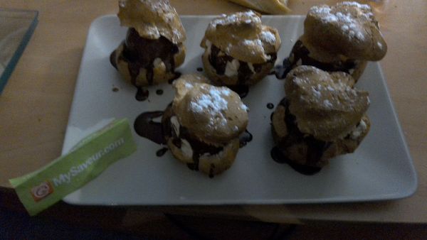 Couper les choux en deux, garnir d'une boule de glace de vanille et napper de la sauce chocolat (vous pouvez saupoudrer les chapeaux de sucre glace). Servir immédiatement.