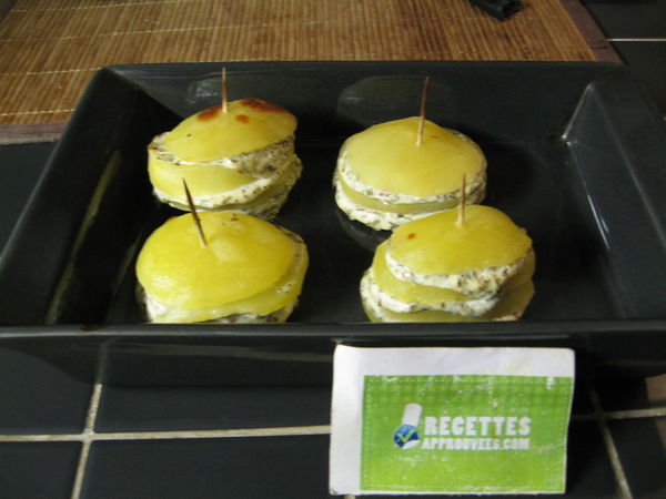 Idée de recette simple et originale. J’ai utilisé de l’estragon et du basilic frais. Le tout est assez savoureux, le fromage est fondant, les herbes donnent du goût mais pas suffisamment à mon avis car pour moi, il manque un peu de caractère à ces pommes de terre. Peut-être faudrait-il ajouter un peu d’ail en poudre, un filet d’huile d’olive et surtout du poivre.