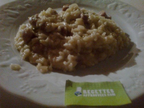 Recette sympa. Ça change du risotto habituel. J'ai utilisé des saucisses de Toulouse. Attention ne pas saler le plat car c'est déjà pas mal salé!