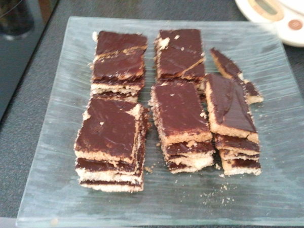 La génoise est trop cuite au bout de 20 min, donc impossible à rouler. Elle ressemble à un biscuit, du coup mon roulé. Cela c'est fini en millefeuille biscuité au chocolat.