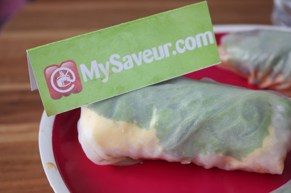 Feuilles de laitue, mayonnaise, radis noir râpé (+ un peu de carottes râpées), avocat (environ 2/3 tranches par rouleaux), (Fac : un peu de tomates cerises en morceaux), 1 ou 2 crevettes (ou surimis/jambon ...), (sauce chili/pimentée, ketchup ou autre sauce au choix comme tout simplement de la sauce à nem ou soja).