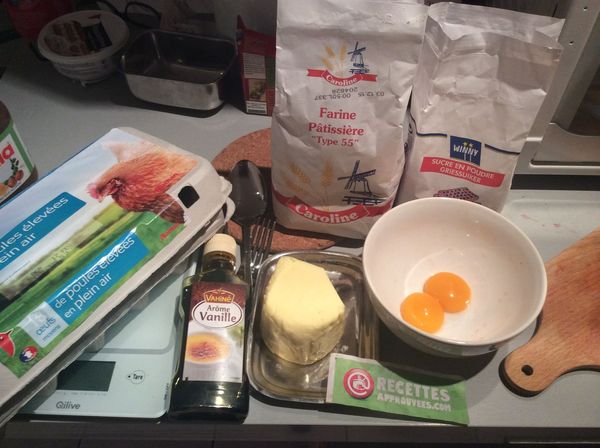 Battre le beurre, l'extrait de vanille, le sucre et les oeufs en mousse. Y ajouter la farine.