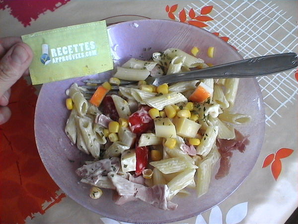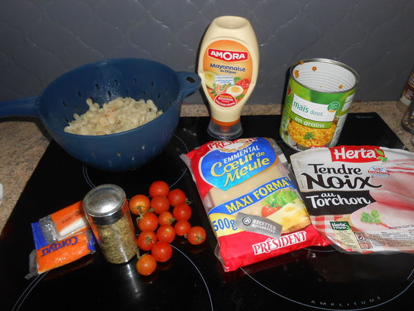 Une recette simple et facile à faire. J'aime beaucoup l'association jambon, surimi. J'ai mis du comté dans cette salade et celui-ci amène beaucoup de gout.