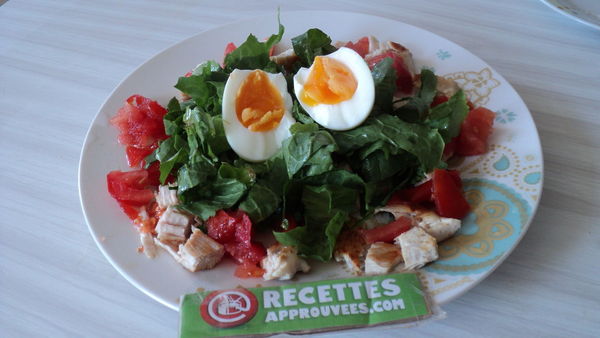 Salade pour le soir bien complète et rapide à faire. J'aurais juste ajouté des échalotes et des aromates. J'ai oublié les œufs dans la casserole.