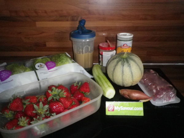 Couper les fraises, la salade, le concombre et le melon en dès.