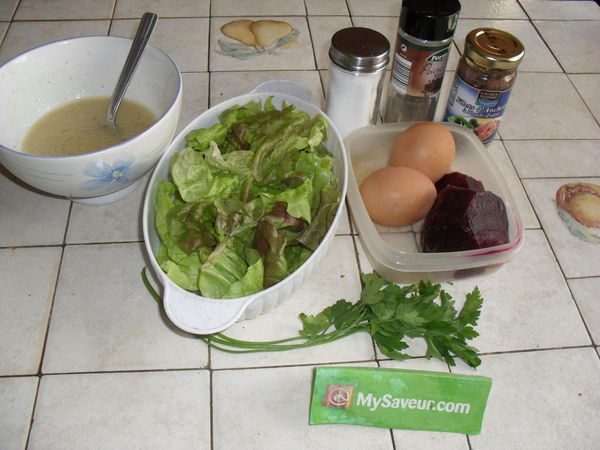 Bonne entrée pleine de légèreté. Les anchois relèvent bien cette salade ainsi que la vinaigrette réalisée avec la moutarde. J'ai oublié le vinaigre sur la photo. Recette facile à faire.