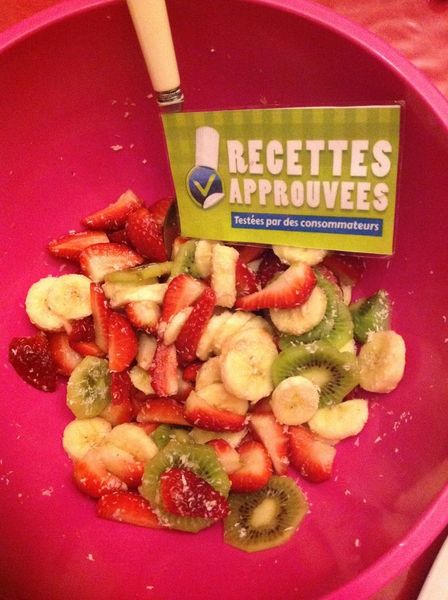 Bonne salade de fruits, ça change des salades habituelles, la noix de coco râpée apporte un petit plus au plat !