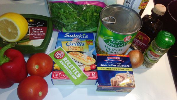 Dans un saladier, mélanger les tomates avec les haricots blancs, le thon égoutté (sans jeter l'huile), les olives noires, le poivron rouge, l'oignon, la roquette et le fromage grillé.